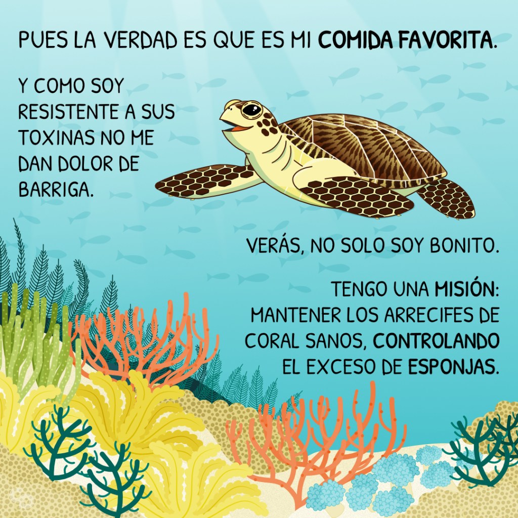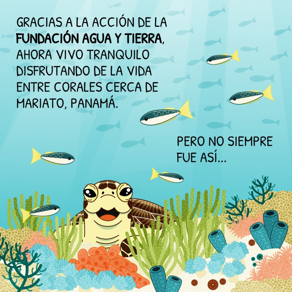 Con esta historia se pretende enseñar algunas de las características más interesantes de la Tortuga Carey (Eretmochelys imbricata), destacando su rol biológico en el mantenimiento del ecosistema de los arrecifes de coral. Asimismo, se busca resaltar los esfuerzos de conservación realizados por la Fundación Agua y Tierra (FUNDAT).